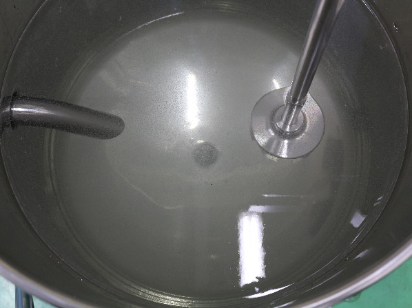 いずれも10分ほど撹拌したところ、タンク+撹拌機 では内側に乾燥した粉を含んだまま表面だけがゲル化したダマが多く残存しました。