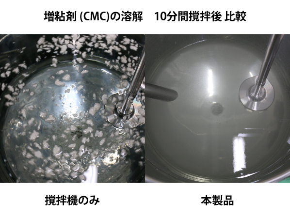 一般的な設備(タンク+撹拌機)と本製品(ミキシングユニット)で、増粘剤(CMC)の水への溶解を比較しました。