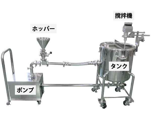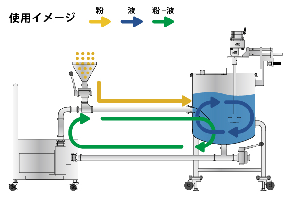 ポンプの液流により生まれる負圧で粉体をホッパーから配管へ引き込み、液体と予備混合。粉体のダマ形成や液面への浮遊を防ぎ、均一に分散するまでの混合時間を短縮します。