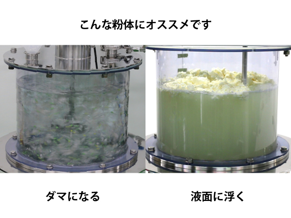 容量や混合する材料の性質にもよりますが、粉末の増粘剤(CMC)の溶解撹拌を比較した実験がございますのでご覧ください。> 動画を見る