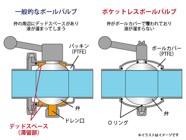 • 弁(ボール)がPTFEで包まれており、本体と弁の間に液が入り込みません。