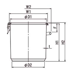 | 型式 | 容量 | 重量 | 内径 | 底径 | 容器外径 | 最大幅 | 容器高 | 全高 | 取っ手高 | クリップ | 板厚 | 納期 | RoHS |